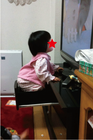 じりじりとテレビに近づいてしまうので、座らせます♪