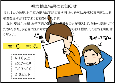 学校の視力検査、我が家も長男が紙をいただいてきました。ただ、ウチは既に眼鏡をかけているので(近視です)、「また悪くなったみたい。新しいフレーム、何にしよう~♪」って、逆に楽しそうです(笑)女子かっ(笑)