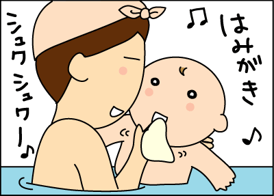うちは、『歯磨きっ、歯磨きっ』って呪文のように口に入れてやります!なんとか、呪文が掛かっているようで、ガブガブしております・・・でも、今日見たら、