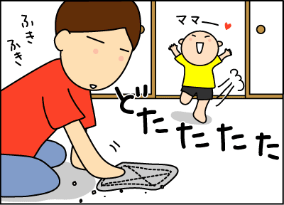 先日おフトンからのジャンプ事件に続いて、また痛そうですね。せっかくご機嫌だったのに。おでこにコブができちゃったかな?