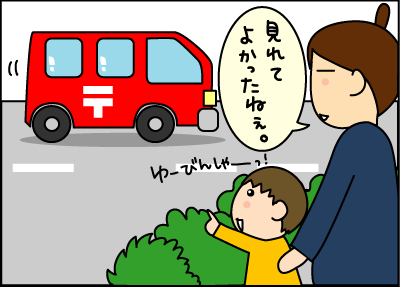 次男クンもお散歩に出られるようになって郵便車を見つけたら、次男クンにも「よかったねぇ」