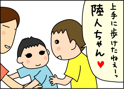 いいな~男の子2人の微笑ましい光景♪拓くんって本当にやさしいお兄ちゃんだね、これからもっともっと2人でたくましく育っていくんだよ!!陸君もあんよ頑張ってるね~ごはんもいっぱい食べるしね(^^)これからも家族みんなでいっぱい笑ってね、ブログこれからも楽しみにしてるね♪