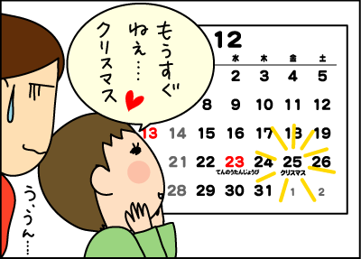 「拓人。もしかしたら、サンタさん1日ずれるかもやで。」
