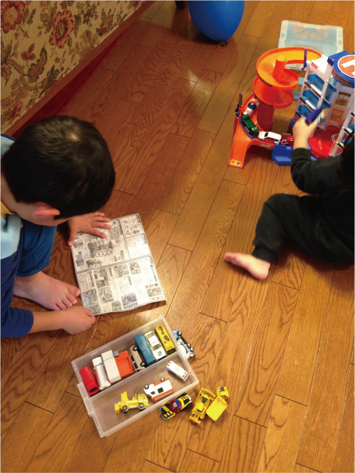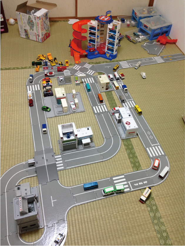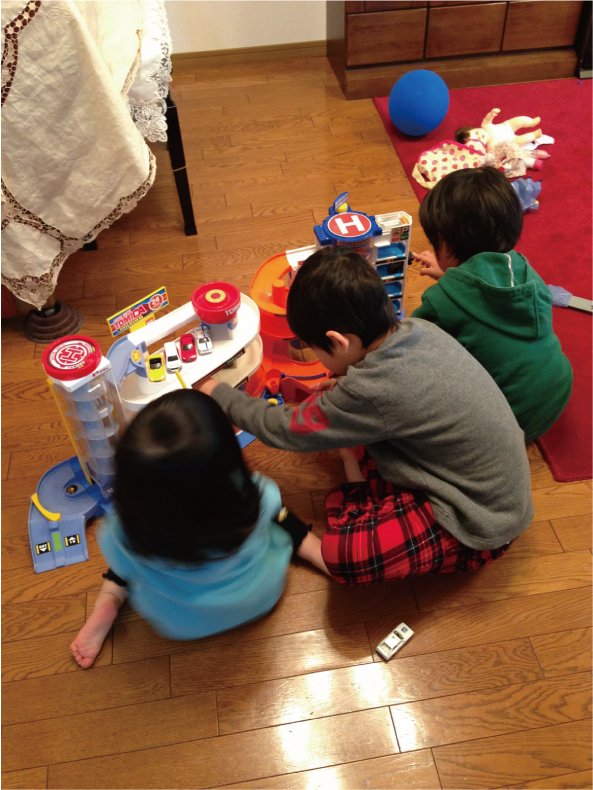 駐車場に止めたりして黙々と遊ぶ拓人。
