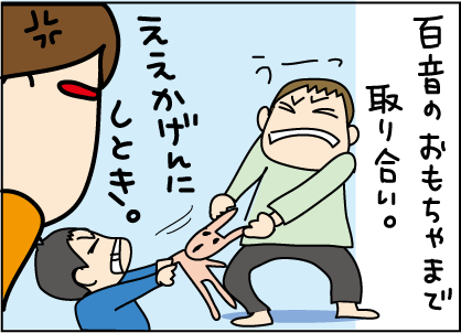 ひっついてお互い一つのおもちゃを取り合って泣き、そして