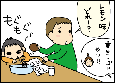 「コーラ味はやだなー。レモン味どれ?」と選んでいる。