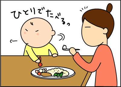 息子さん、自立への第一歩ですね。自分でスプーンやフォークが使えるようになったら、けえこさんとお食事もできて楽しいでしょうね。