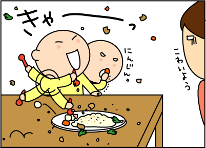 どっちを先にしても結局部屋中ご飯まみれなんです
