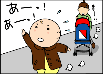 息子がベビーカーで暴れている。
