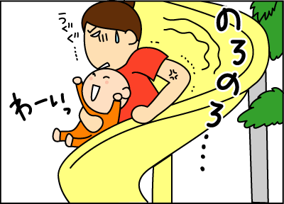 すべり台、大変ですね。まだ一人ですべらせるには息子さん、小さいし。でも、そのらせん状のすべり台の激しさが、子供の遊び心をそそるんでしょうね。