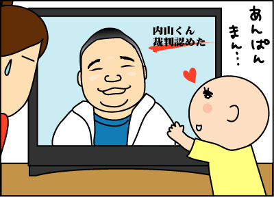 アンパンマンと内山くん・・・「まる」つながりでしょうか!?子供って、人の顔を覚える方法って、かなりおおざっぱな気がします。