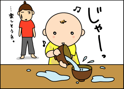 きっといつかうちもジャージャー遊びを始めるんでしょうね。きっとすきだと思います。今は、コップに手を入れるのが大好き。ご飯の時は、ご飯をおかずのお皿へ、おかずをお汁のお椀へと入れ替えています。そのうち、お椀を持ってジャーとやるのでしょうか… 恐怖。