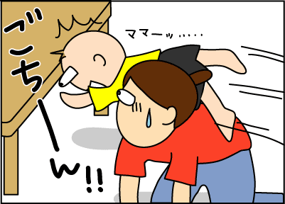 先日おフトンからのジャンプ事件に続いて、また痛そうですね。せっかくご機嫌だったのに。おでこにコブができちゃったかな?