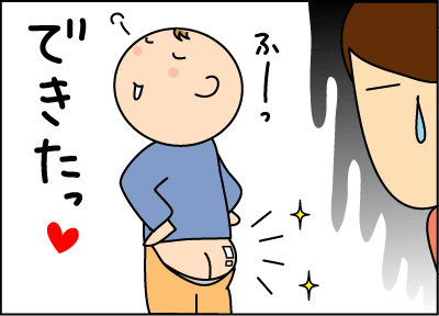 我が家の息子、年少になってファスナーさげるだけでおしっこできるまで進歩しましたが、いまだに自分でズボンをはくとお尻が出てます。。。