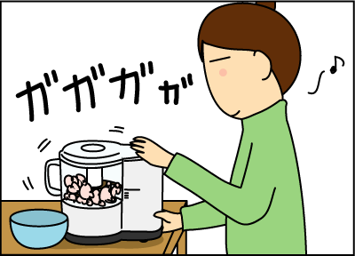 鶏肉をFPでガー。ボールにうつして調味料を混ぜる。