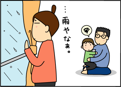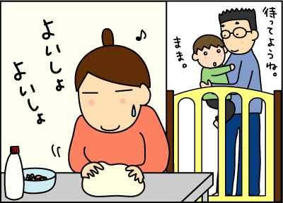 ママがパンをこねている間、パパに抱っこされて「ママ」って
