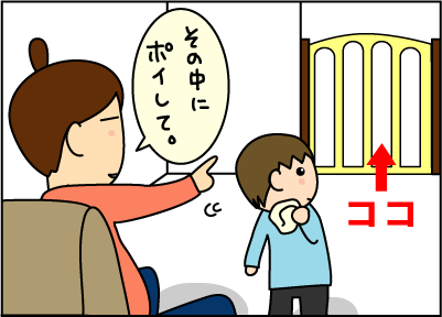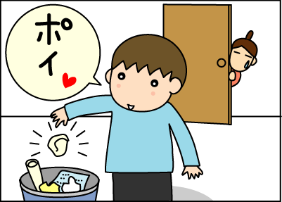 うわっ。拓人くん、えらい~。ちゃんと、ゴミはゴミ箱にって理解してるんですね。