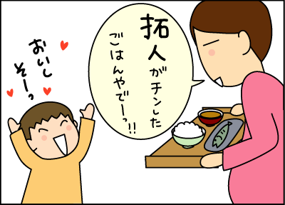 うちも夕飯の席になかなかついてくれず困ることが多々あったので(座っても食べなかったり…)けえこさんの作戦試してみます♪自分でしたと思ったらご飯も進むのかな!?