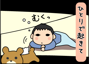 うちははじめての子供だけど一人で目が覚めてもやはり泣きません。それどころかソファーでまったりしていた事もあります。自分が先に寝てしまってされたいたずらがスティックパン6本を細かくちぎって床になげその上から1リットル丸まる入っていたジュースをまきちらした事。二度と先に寝てはいけません!こわい復讐が待っています!