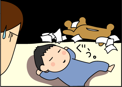 「ティッシュの山。横で寝ている陸人。」