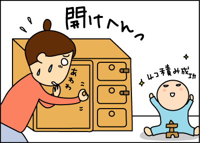 既に戸棚開けに飽きて積み木で遊ぶ息子。トホホ。