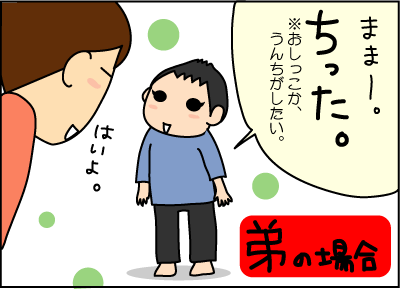 妹はトイレに入るお兄ちゃんの影響で、おむつに出た後ですが「しっこ、しっこ」うんちは「うんっ、うんっ」と言いながらオムツを叩いて教えます。1歳5ヶ月だからまだトレーニングはいいかなと思っているのですが・・・。ただ私が面倒なだけですが(汗)