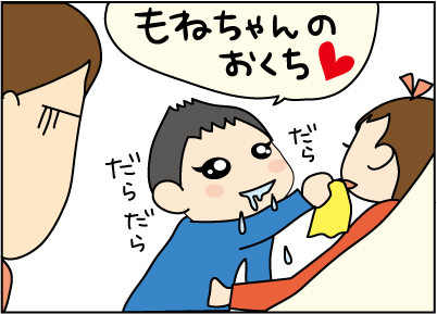 よだれを拭くのに必死で、よだれめっちゃたらしてます(笑)